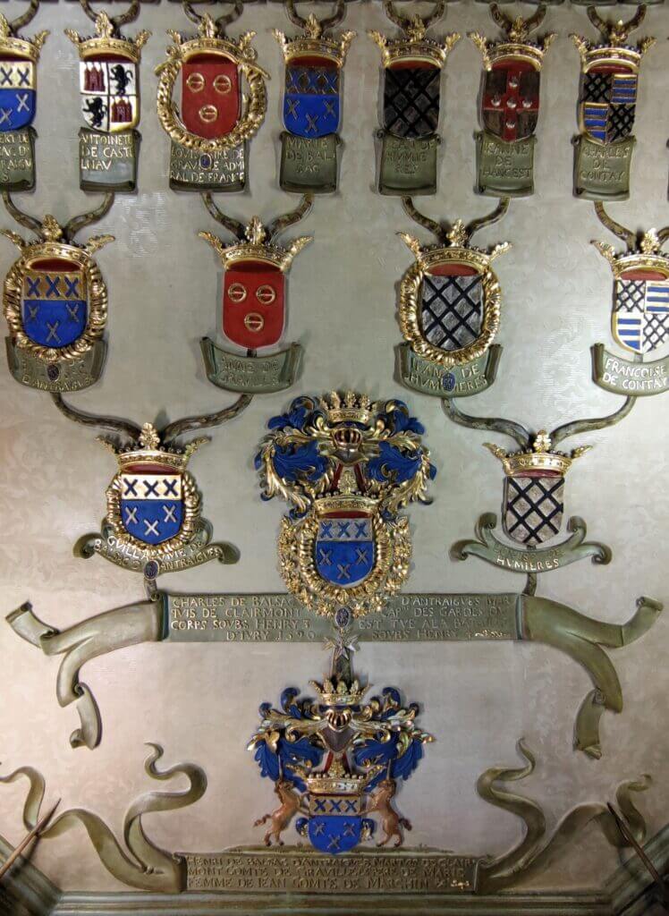 Hay que prestar especial atención a los estucos, molduras y artesonados que decoran los techos. Nada más entrar al hall (la sala de guardia), es imposible no fijarse en el árbol genealógico que decora el techo. Solamente hay que recorrer unas salas para encontrarse con otro árbol genealógico, esta vez en la pared. Es el del Conde de Marchin.