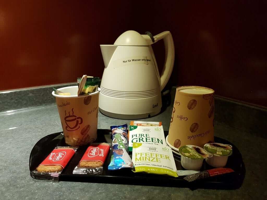 Cuentan con tres maquinas que dispensan bebidas. Una de ellas es la que corresponde a los zumos. Las otras dos a cafés. Yo no tomo esta bebida, pero mis padres comentaron que estaba muy bueno. Para los que cómo yo no tomen café, el hotel ofrece también una discreta selección de tés. Como detalle, todos los clientes pueden tomar el café que gusten durante el horario del desayuno (hasta la 10:30 a.m.) sin cargo. Por lo que quien quiera desayunar en la habitación puede bajar a por su café y subirlo sin problema a la habitación.