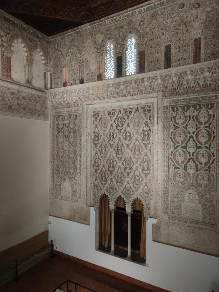 Si solamente queréis visitar una de las dos sinagogas de Toledo, yo elegiría esta. Su exterior no hace imaginar la belleza de su interior. De esa sala diáfana con una decoración en su paredes que en algunos casos hacen imaginar grandes alfombras persas. Merece la pena dedicar tiempo a fijarse en los detalles para descubrir como en este bello edificio se funden las culturas cristina, judía y musulmana. Textos hebreos, dibujos geométricos, motivos vegetales, escudos heráldicos, arcos de herradura. Todo bajo una impresionante cubierta de madera.