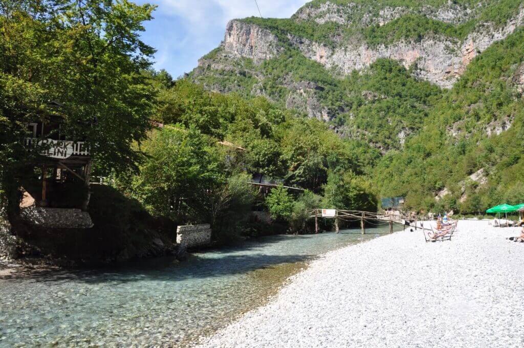 El resultado de la dichosa excursión a Río Shala en el Lago Koman fueron dos horas caminando sobre piedras que nos destrozaron los pies para llegar a un espacio en el que el río, ciertamente, se tiñe de color turquesa en algunos puntos. Es una zona amplia y soleada, con bares y restaurantes que ofrecen mesas, tumbonas y sombrillas. Pero desgraciadamente, el nivel del río era también muy bajo.