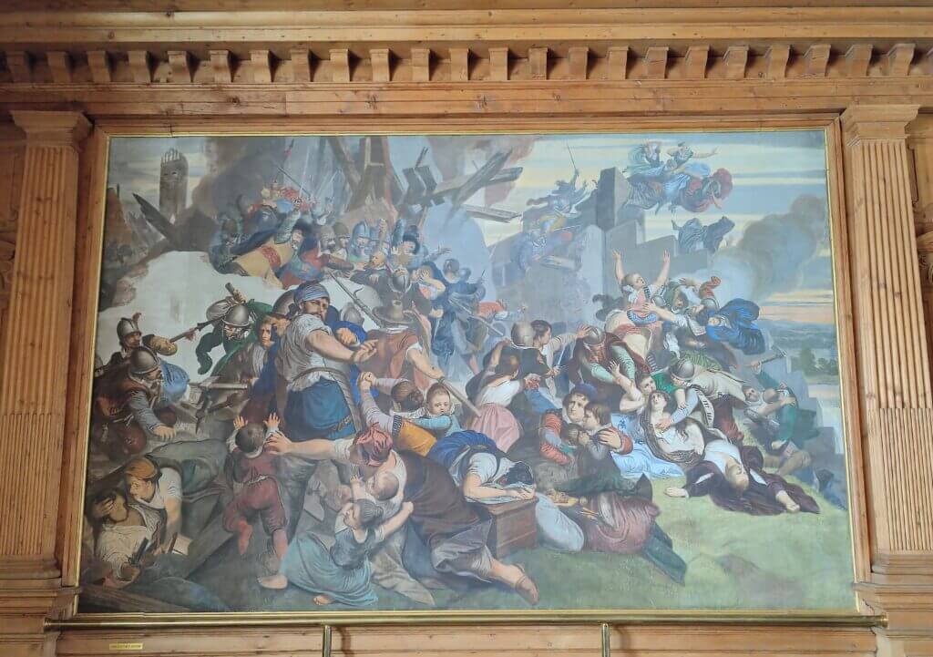 Una escalera lleva a los pisos superiores de este pequeño pero excepcional ayuntamiento. En las diferentes salas se pueden ver más estucos de Zimmermann, estufas de azulejos, tapices y cuadros de gran tamaño de Hubert von Herkomer.