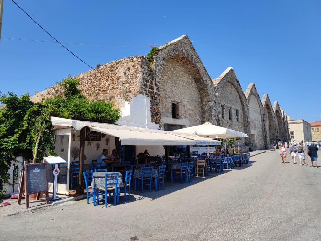 El gran puerto veneciano de Chania cuenta con varias zonas. Todas interesantes y atractivas. Nosotros empezamos el paso por su zona este. Llegamos callejeando por sencillas calles hasta dar con la parte posterior de los astilleros, el lugar en el que se reparaban los barcos durante el invierno. Grandes construcciones que se han mantenido en pie y que ahora alojan bares, restaurantes, salas de exposiciones y parte del Museo Marítimo de Creta (entrada de pago).