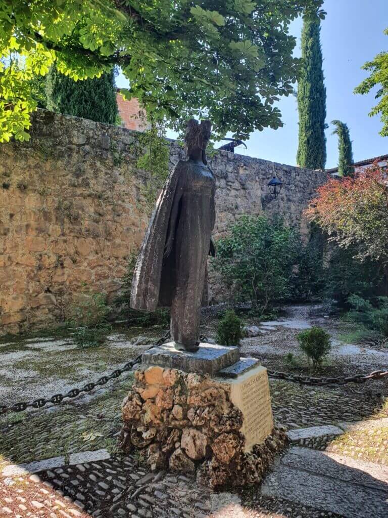 Frente al templo, a la sombra de varios árboles y cerca de la muralla, se puede ver una escultura de Kristina de Noruega, un regalo de la ciudad de Tønsberg a Covarrubias. Falleció en Sevilla tras solamente llevar casada cuatro años. Puede que de nostalgia por las tierras verdes y frías del norte. Tras su muerte quedó pendiente una promesa de su esposo: construir una capilla dedicada a San Olav en la que poder rezar. Una promesa que el infante Felipe no cumplió, pero… Seguid leyendo que os contaré más de esta historia.