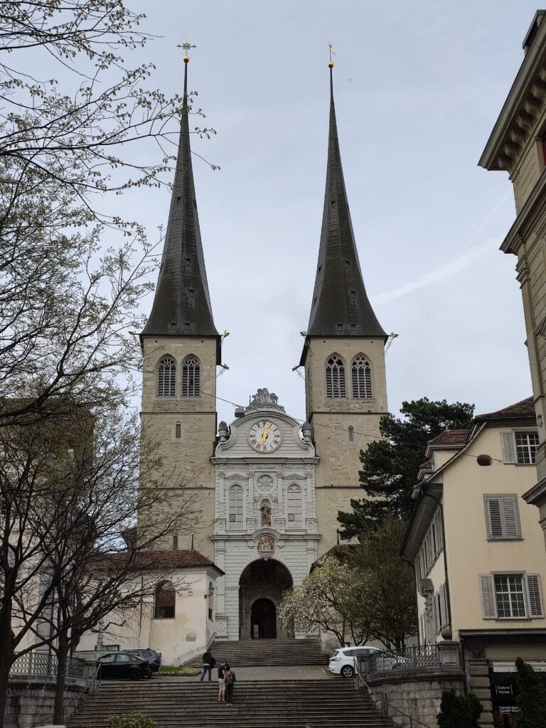 El siguiente lugar de nuestra ruta por los lugares que ver en Lucerna está muy cerca del lago. Es la iglesia de San Leodegar y para llegar a ella solamente hay que caminar unos minutos por Löwenstrasse. Al llegar al final de esa calle, a la izquierda, está la iglesia rodeado por un conjunto de casas de entrada que convierten la plaza de la escalinata que da acceso al templo en uno de esos rincones llenos de encanto de Lucerna.