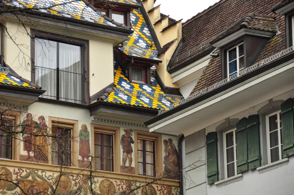 A pocos metros, dejando la plaza por la izquierda, se llega a otra de las bonitas plazas que ver en Lucerna, la Hirschenplatz, con preciosas casas decoradas que son edificios históricos de la ciudad.