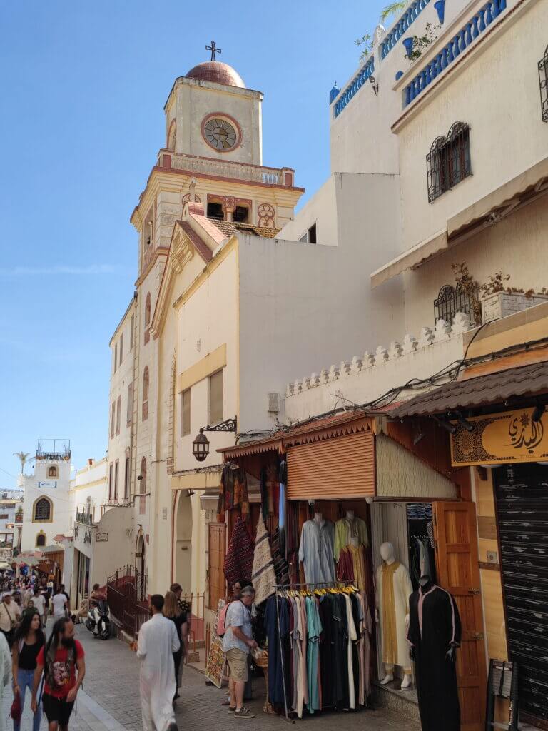 Entre los tejados de la Medina, destacando sobre las construcciones blancas, aparece el minarete decorado en tonos verdes de la mezquita. Fue construida sobre una antigua catedral portuguesa que fue levantada sobre un templo romano dedicado a Hércules.