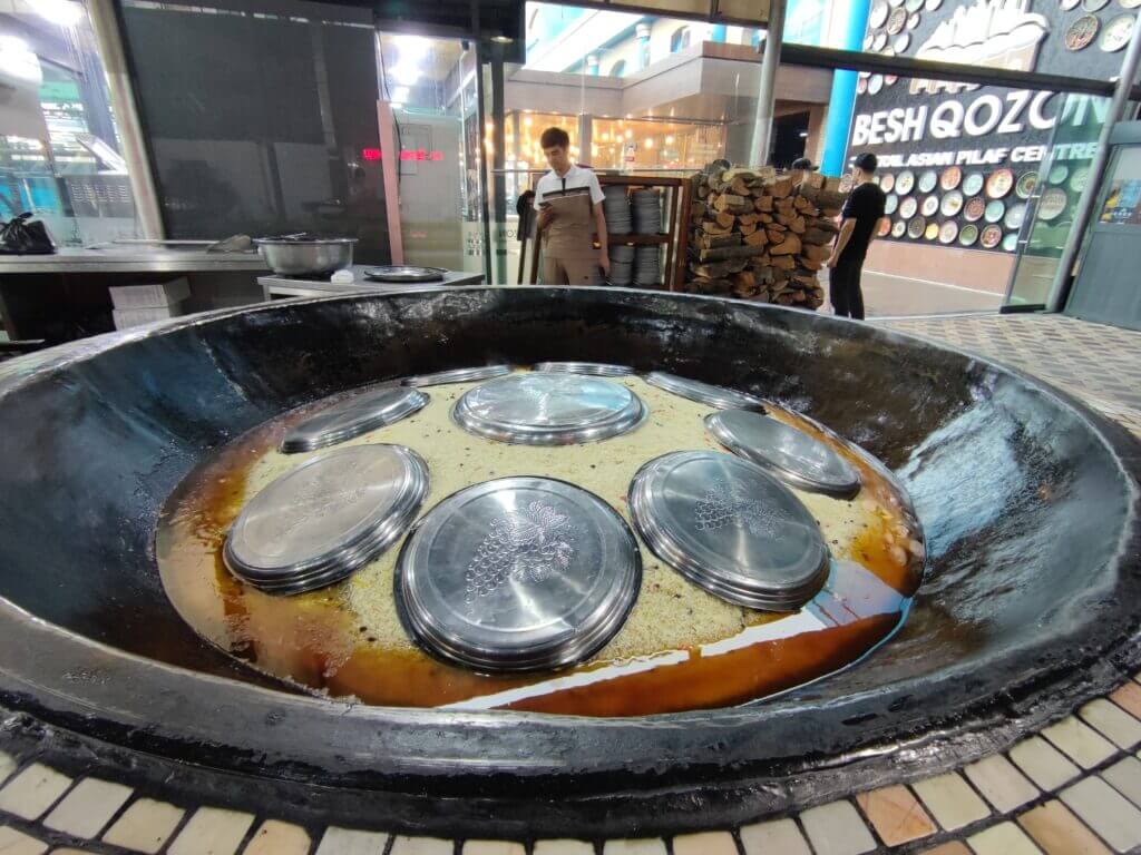 Repartidos por Tashkent hay varios lugares para descubrir cómo se cocina el plato nacional uzbeko, el plov. Nosotros fuimos a Besh Qozon más por casualidad que por otra cosa. Llovía, pedimos un taxi en el hotel al plov center y nos llevaron a este local.