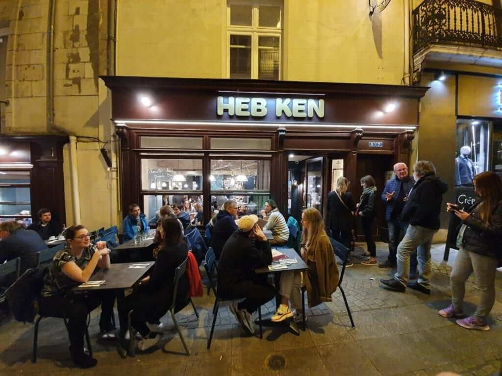 El plato estrella de Hep Ken son las galettes. La versión bretona de los crêpes. Las primeras se elaboran con trigo sarraceno y el resultado es una masa más oscura, salada y ligeramente crujiente. Perfecta para platos salados. Son muchas las opciones de esas galettes en la carta del restaurante. Con un pequeño puñado de ingredientes se elaboran un buen número de combinaciones. El ingrediente principal pueden ser las patatas, la cebolla o los champiñones. El queso, el jamón o huevos son también parte de la receta final. Y para acompañar, sin duda, sidra bretona.
