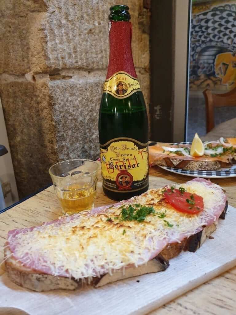 El plato que todo el mundo parece querer comer en L’Epicerie son sus tartines. Lo que en España llamamos tostas. Las hay frías y calientes y en dos tamaños. Normal o XXL. Los precios oscilan entre los 5 € y los 14 € y varían según los ingredientes y el tamaño. Nosotras nos pedimos dos XXL y os aseguro que nos costó terminar con ellas. Menos mal que teníamos sidra bretona para beber y eso facilitó conseguir tragar esas enormes tartines. Eso y la botella de agua que nos trajeron sin necesidad de pedirla (ni pagarla, algo que en España podrían tomar también como norma).