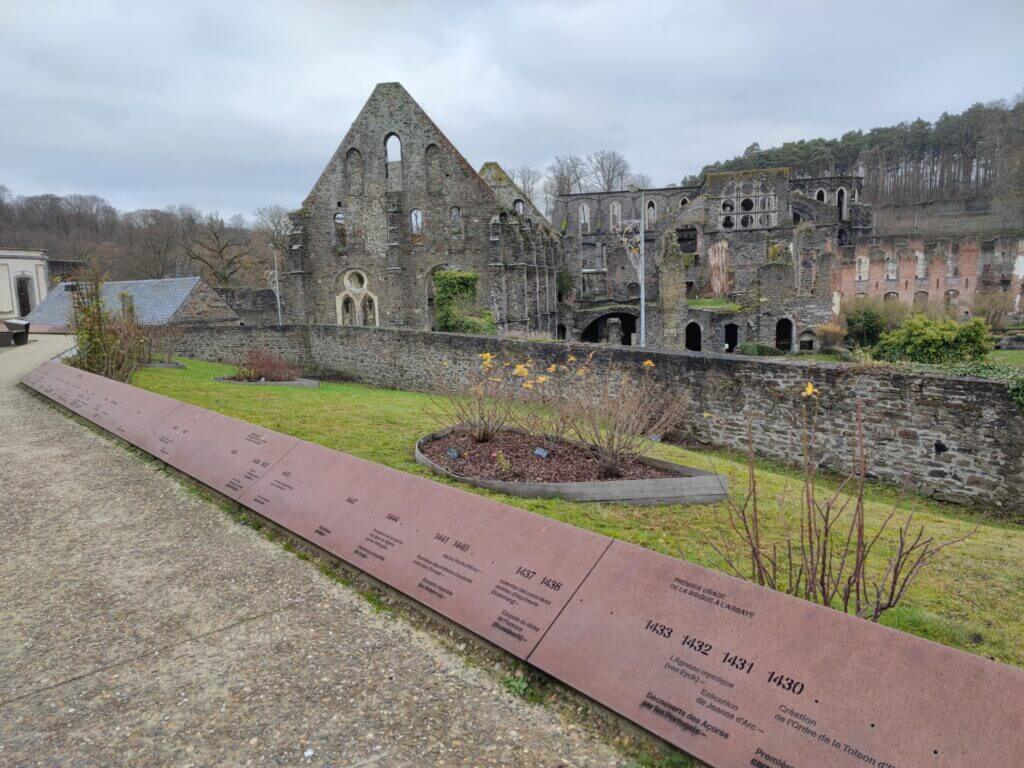 Al final de ese sendero, se cruza la carretera por un paso elevado. Unas escaleras (o un ascensor) llevan a nivel del suelo y de las diferentes construcciones de la abadía de Villers-la-Ville.