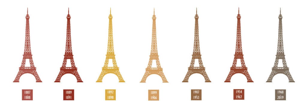 Desde su construcción ha estado pintada de diferentes colores, desde el marrón rojizo al que amarillo ocre. La pintura se renueva cada 7 años siguiendo las instrucciones del propio Gustave Eiffel, retirando la anterior capa dañada por la lluvia el sol y el viento. Desde 1968 la torre ha estado pintada del conocido como marrón Torre Eiffel. La última vez que se comenzó la labor de pintar la torre fue en 2019. El objetivo era que estuviera lista para la Olimpiadas de París de 2024, recuperando el color que tenía en 1907.